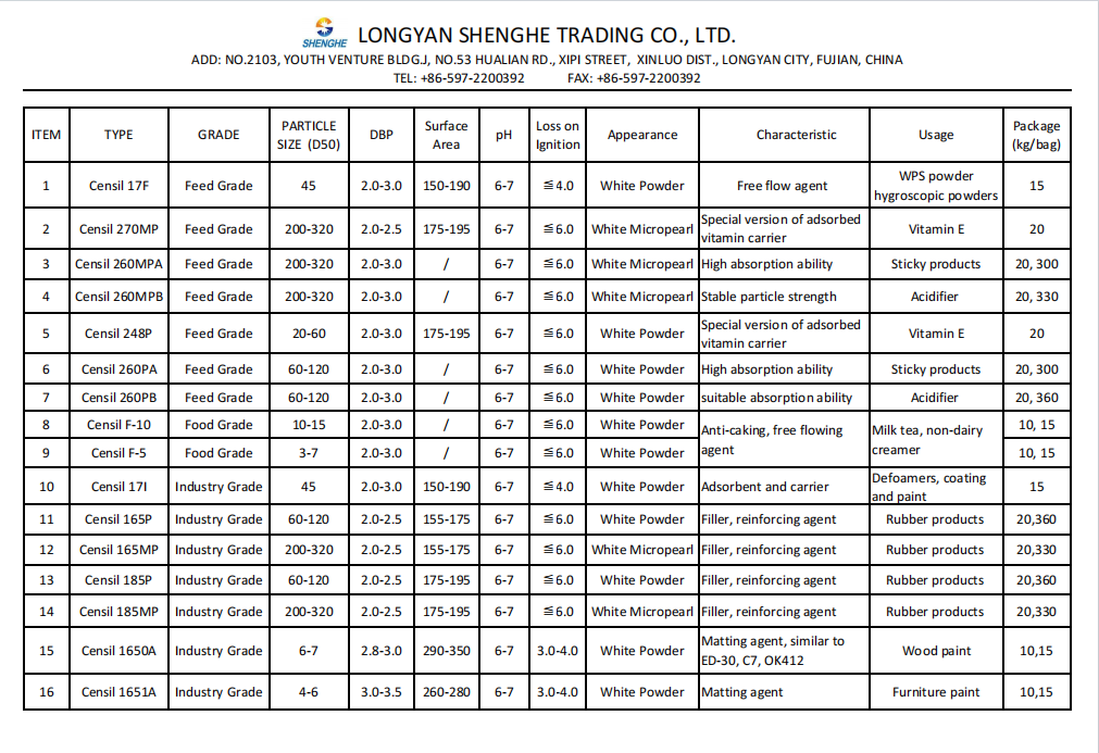In a world where purity, performance, and reliability are paramount, selecting the right industrial partner is crucial. At Longyan Shenghe Co., Ltd., we specialize in the manufacturing and supply of high-purity Silicon Dioxide (SiO₂), serving as a foundational component across multiple critical industries. With an unwavering commitment to quality and safety, we empower businesses in the food, feed, rubber, and plastics sectors to achieve superior product performance and operational excellence.Uncompromising Quality for Diverse ApplicationsOur core strength lies in tailoring our Silicon Dioxide to meet the precise demands of your industry. We understand that a one-size-fits-all approach does not work, which is why we offer specialized grades to deliver optimal results in your specific applications: Food Additives (E551): As a premier anti-caking agent, our Food-grade silicon dioxide ensures your powdered products—from spices and milk powder to instant beverages—remain free-flowing, dry, and easy to process. It guarantees consistent quality, extends shelf life, and protects your product's integrity from production to the consumer's pantry. Feed Anti-caking Agent: In animal nutrition, feed flowability is directly linked to operational efficiency and animal health. Our feed-grade SiO₂ prevents caking and bridging in mash and pelleted feeds, ensuring smooth handling through automated systems. This results in reduced waste, accurate dosing, and the preservation of vital nutrients, supporting optimal growth for livestock, poultry, and aquaculture. Rubber Industry: In rubber compounding, our Silicon Dioxide acts as a high-performance reinforcing filler. It significantly enhances key physical properties, including tensile strength, tear resistance, and abrasion durability. Whether for tire manufacturing, industrial belts, or seals, our products contribute to longer-lasting, more reliable rubber goods. Plastics Industry: For plastic processors, our synthetic Silica improves key processing characteristics. It functions as an effective anti-blocking agent in polyolefin films, preventing layers from sticking together. Additionally, it can enhance rheological properties and serve as a Matting Agent, giving you greater control over the final appearance and performance of your plastic products.Our Foundation: Certifications That Build TrustAt Longyan Shenghe, our promises are backed by internationally recognized certifications. We hold the ISO 22000 food safety management system certification, a testament to our rigorous controls and commitment to producing safe materials for the food and feed chains. Furthermore, our HALAL certification assures our Muslim customers that our products and manufacturing processes comply with Islamic dietary laws, opening doors to global markets. These certifications are not just badges on our website; they are integral to our operational DNA. From raw material selection to final packaging, every step is monitored to ensure a consistent, pure, and reliable product that meets the highest global standards.Why Partner with Longyan Shenghe?Vertical Integration & Control: Our control over the production process allows for unmatched consistency and competitive pricing. Technical Expertise: Our team provides exceptional technical support, helping you select the ideal grade and specification for your application. Customer-Centric Approach: We view our customers as long-term partners. We are committed to your success, offering flexible solutions and reliable supply chain management. Choose Longyan Shenghe Co., Ltd. as your strategic supplier of Silicon Dioxide. Let us be the silent, essential ingredient that elevates your products, streamlines your production, and solidifies your market reputation. Contact us today to discuss your requirements and request samples.